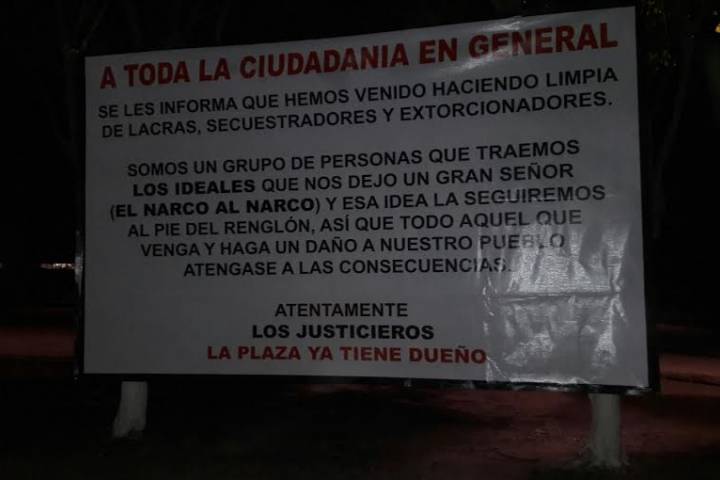Varias narcomantas fueron colocadas en esta ciudad de Lázaro Cárdenas y en las Tenencias de este municipio, estaban firmadas por un grupo autodenominado "Los Justicieros". Apenas el sábado pasado "La Nueva Familia" puso diversos rótulos en Zamora, Jacona y Tangamandapio, a raíz, de ello hubo un detenido. Altos funcionarios del Gobierno de Michoacán afirmaron en charlas con RED 113 que no se iba a permitir la aparición de nuevos grupos de... Ver más...