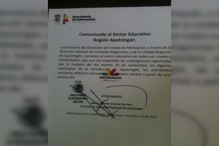Al considerar que hay condiciones de seguridad para que los alumnos acudan a clases, la Secretaría de Educación del Estado dio marcha atrás a la suspensión de labores que decretó el mediodía de hoy tras la serie de bloqueos carreteros que se registraron en Apatzingán y Buenavista, y ordenó reanudar labores en las escuelas este miércoles en sus turnos matutino y vespertino.