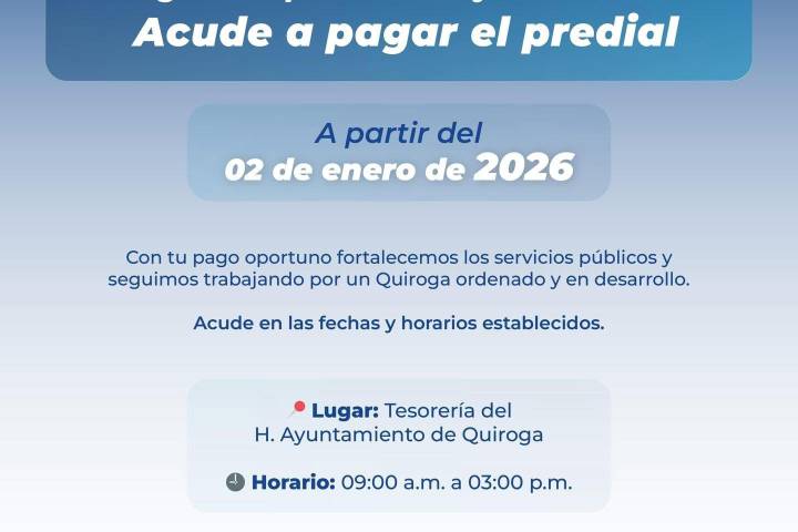 Durante todo el mes de enero se encuentra vigente el periodo para realizar el pago del impuesto predia y del servicio de agua potable, una contribución fundamental para fortalecer los servicios públicos y continuar avanzando hacia un municipio más ordenado y en desarrollo. Así lo destacó la presidenta municipal de Quiroga, Alma Mireya González Sánchez, quien subrayó que cumplir de manera oportuna con esta obligación permite al gobiern...