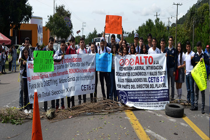Profesores, empleados y alumnos del Centro de Estudios Tecnológicos, Industrial y de Servicios (Cetis) número 27, bloquearon por espacio de cuatro horas, la carretera Uruapan-Paracho, frente a esa institución, quienes demandan la destitución del director Antonio Garnica Gómez; por la tarde realizarían un mitin y una marcha en el centro de la ciudad.