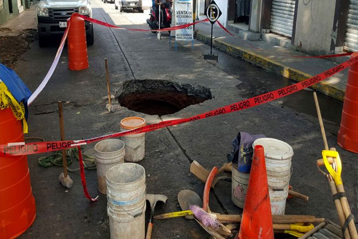 Un socavón de cerca de tres metros de profundidad, se registró el día de ayer en la calle de Nicolás Romero, frente a la entrada del estacionamiento del mercado Nicolás Romero, en el centro de la ciudad de Uruapan, ello, a causa de la ruptura de la tubería del drenaje, según dijeron las autoridades.