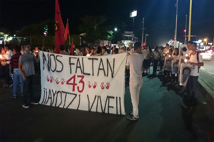 NOTICIAS 12/11/2014Con mega marcha pacífica, se manifiestan en LCLa noche de este martes, aproximadamente 900 personas realizaron una marcha silenciosa sobre las principales calles de Lázaro Cárdenas como medida de protesta por la desaparición de normalistas de Ayotzinapa, Guerrero; el movimiento culminó con el encendido de veladoras y la colocación de 43 pupitres en los que se apreciaban las fotografías de los estudiantes ausentes.