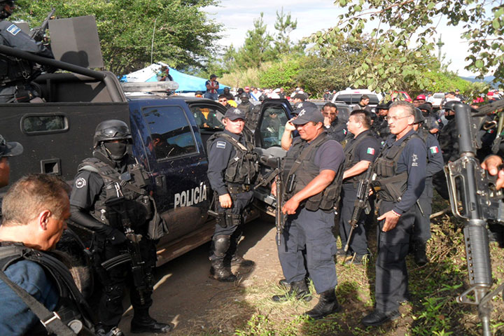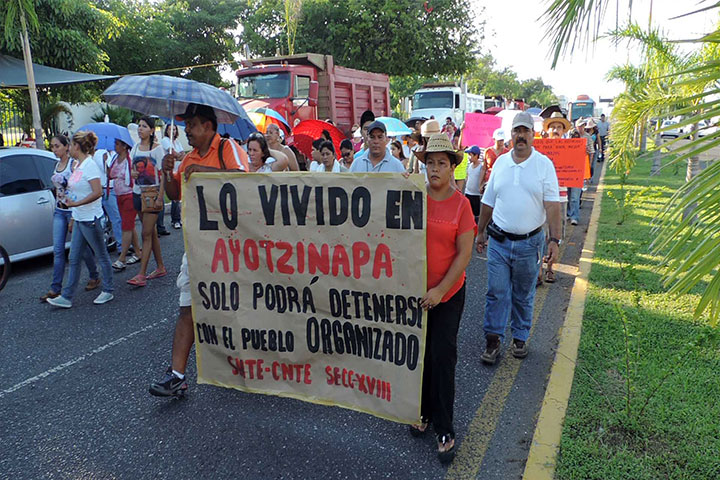 Familiares, maestros y estudiantes de Ayotzinapa Guerrero marcharon, junto a un nutrido grupo de miembros de la CNTE, desde la entrada del Puerto hasta el centro de la ciudad, mostrando su repudio contra el homicidio de cuatro normalistas y en apoyo de los jóvenes aun desaparecidos en el vecino estado guerrerense.