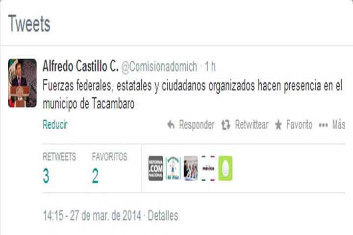 Lo anterior fue confirmado en su cuenta de twitter, por el Comisionado para la Seguridad de Michoacán, Alfredo castillo, quien agregó que el ingreso ocurrió el mediodía de este jueves por parte de las f... Ver más...