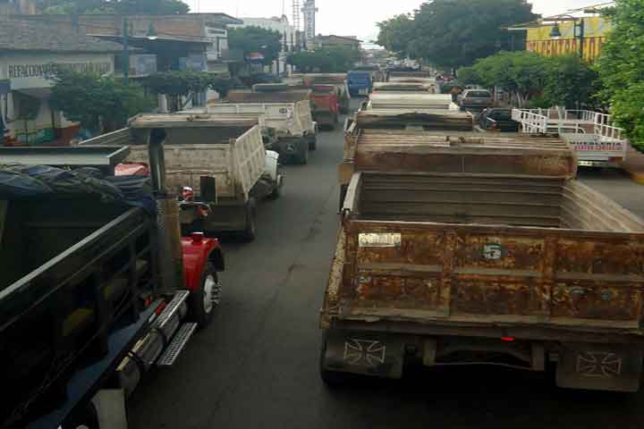 Aproximadamente un centenar de camiones tipo volteo, realizan un plantón frente a la Presidencia Municipal, en demanda del pago de adeudos y cumplimiento del acuerdo con las organizaciones sobre igualdad en los contratos.