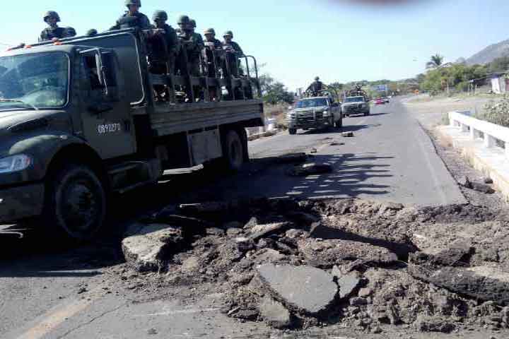 Mientras soldados, marinos y policías federales hacían despliegue de poderío en el corazón de Apatzingán, desconocidos destrozaron un tramo de la carpeta asfáltica del puente "Las Delicias", en un hecho que fue considerado como un intento por derribar esta estructura que, a causa de los daños, quedó habilitada en un solo carril, y así se quedará hasta ser reparada por las autoridades.