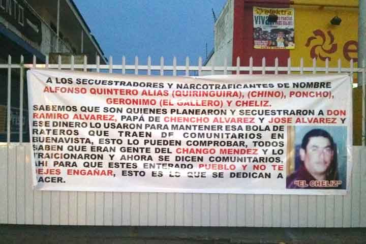 Algunos de los rótulos aparecieron en Los Reyes, Tocumbo y Peribán, textualmente rezaban: "A los secuestradores y narcotraficantes de nombre Alfonso Quintero alias (quiringuara), (chino), (poncho), Gerónimo (el gallero) y el chelis, sabemos que son quienes planearon ... Ver más...
