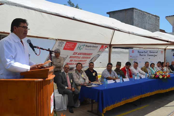 El Hospital General de Tacámbaro "María Zendejas", conmemoró este jueves el XIV Aniversario de su fundación; tan sólo en el año 2012 este nosocomio prestó atención médica de manera externa a más de 33 mil personas, quienes requirieron servicios de urgencia, estudios de laboratorio, consultas, entre otros.