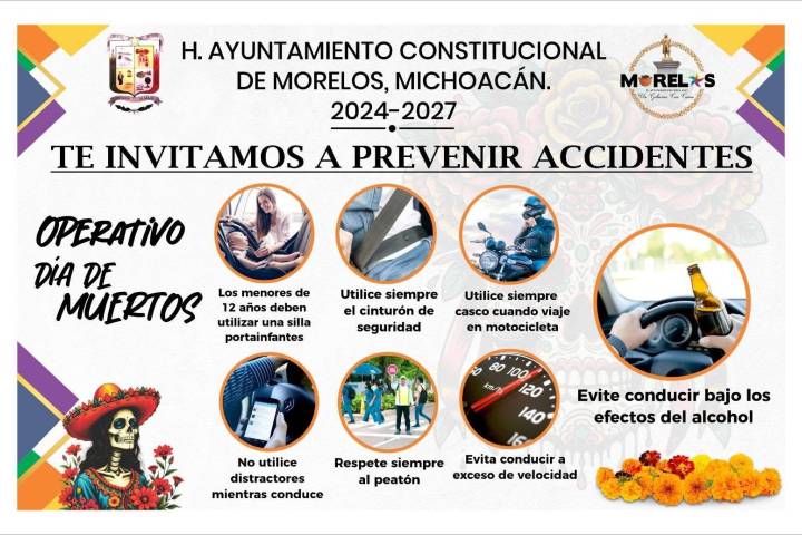 NOTICIAS 30/10/2025Refuerza Ayuntamiento de Morelos la seguridad vial con operativo especial por el Día de MuertosCon el objetivo de salvaguardar la integridad de las familias durante las festividades del Día de Muertos, el presidente municipal, Julio César Conejo Alejos, informó que el Ayuntamiento de Morelos, a través de la Dirección de Seguridad Pública y Tránsito, implementará un operativo especial de prevención de accidentes en todo el municipio.