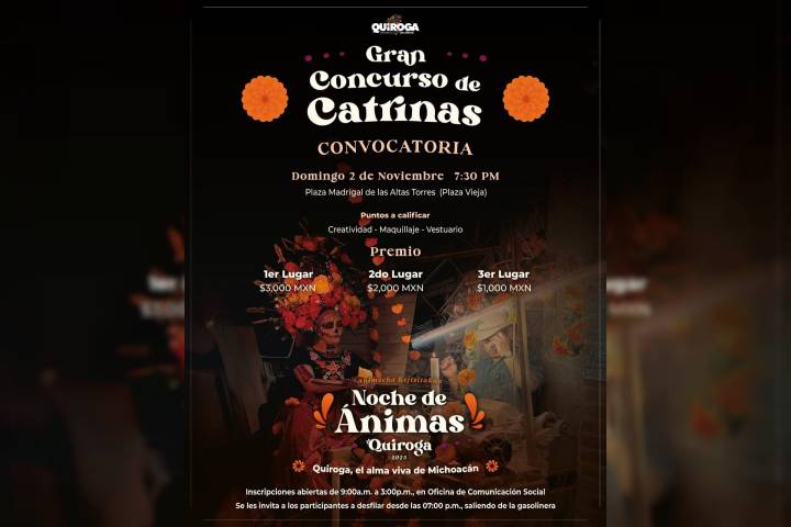 NOTICIAS 30/10/2025Quiroga se prepara para celebrar la Noche de Ánimas con el Gran Concurso de Catrinas 2025Con el propósito de preservar las tradiciones que dan identidad y orgullo al pueblo michoacano, la presidenta municipal de Quiroga, Alma Mireya González Sánchez, invita a la ciudadanía a participar en el Gran Concurso de Catrinas 2025.