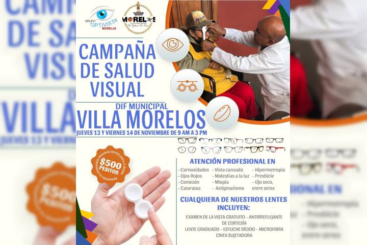 NOTICIAS 10/11/2025Impulsa Ayuntamiento la salud visual en Morelos con jornada gratuita de atenciónCon el objetivo de acercar servicios de salud visual accesibles y de calidad a la población, el Ayuntamiento de Morelos, que encabeza Julio César Conejo Alejos, en coordinación con el Grupo Optivista Morelia y el Sistema DIF Municipal, llevará a cabo la Campaña de Salud Visual los días jueves 13 y viernes 14 de noviembre, en un horario de 9:00 a.m. a 3:00 p.m.