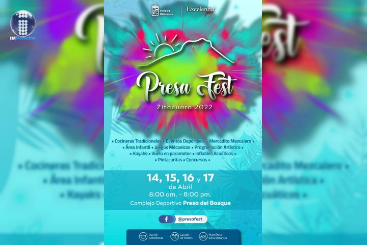 NOTICIAS 08/04/2022Invita Zitácuaro al Presa FestEl municipio de Zitácuaro se prepara para el Presa Fest, del 14 al 17 de abril en el Complejo Deportivo de La Presa del Bosque.
