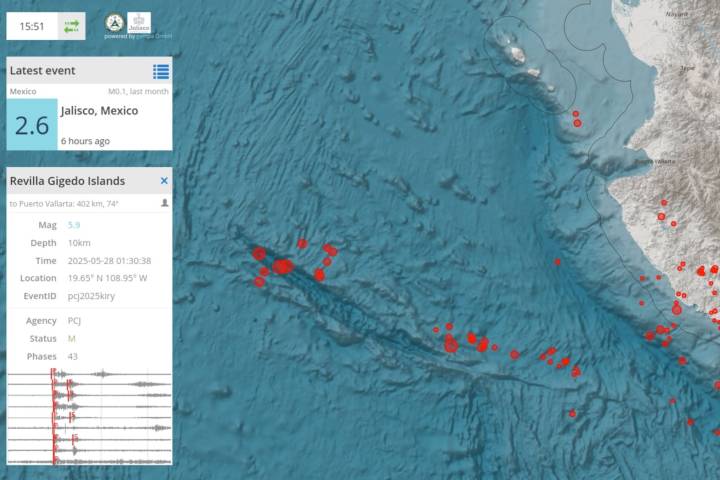 NOTICIAS 28/05/2025Incremento en la actividad sísmica al noroeste de la Fractura de RiveraEste martes 27 de mayo se registraron varios sismos en el extremo noroeste de la Fractura de Rivera, una falla transformante ubicada mar adentro, lejos de la costa de Jalisco.