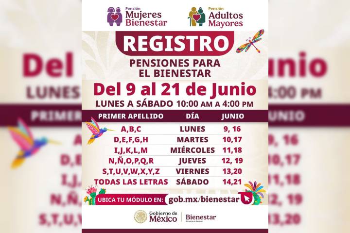 NOTICIAS 09/06/2025En junio, registro a Pensiones para el BienestarEn la conferencia matutina: "Las mañaneras del pueblo", que encabeza la Presidenta Claudia Sheinbaum Pardo, la secretaria de Bienestar, Ariadna Montiel Reyes, informó que, del 9 al 21 de junio, se realiza en todo el país el registro a las Pensiones Mujeres Bienestar y para el Bienestar de las Personas Adultas Mayores.