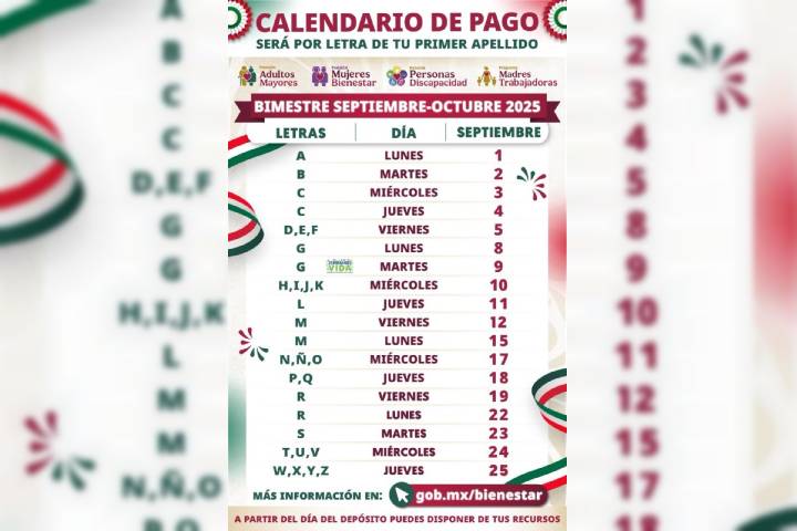 NOTICIAS 01/09/2025Este 1° de septiembre inicia pago de las Pensiones para el Bienestar La secretaria de Bienestar, Ariadna Montiel Reyes, informó que, del 1 al 25 de septiembre, los derechohabientes y beneficiarios de las Pensiones y Programas para el Bienestar de las mujeres, adultos mayores, personas con discapacidad, madres trabajadoras y las y los sembradores, recibirán el pago correspondiente al bimestre septiembre–octubre.