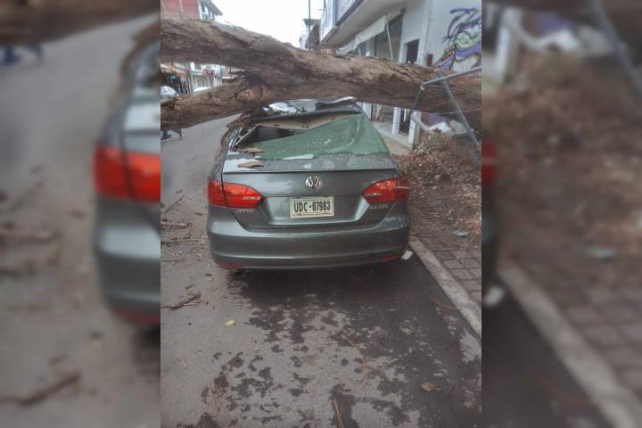Un árbol de gran tamaño se desplomó y cayó sobre un auto particular, que estaba estacionado en la calzada La Fuente de la ciudad de Uruapan, sin que por fortuna se reportaran personas heridas.