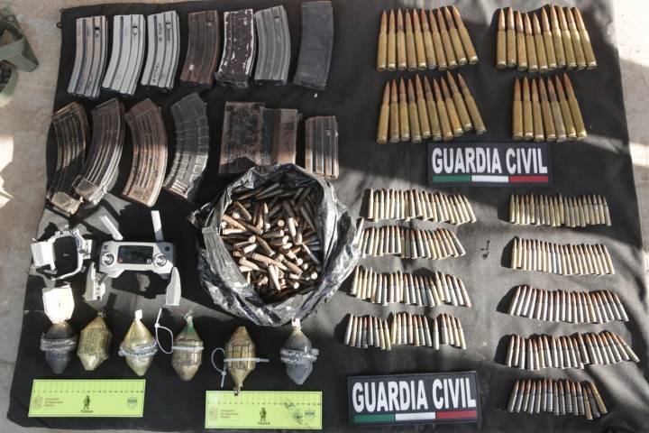 NOTICIAS 12/09/2023SSP, Sedena y GN aseguran seis explosivos para drones y cientos de cartuchos útiles, en La Ruana Derivado de las tareas operativas efectuadas por personal de las secretarías de Seguridad Pública (SSP), y de la Defensa Nacional (Sedena), y la Guardia Nacional (GN), en la localidad de Felipe Carrillo Puerto (La Ruana), se logró efectuar el aseguramiento de seis artefactos explosivos utilizados para drones, así como cientos de cartuchos útiles de distintos calibres, cargadores, equipo táctico y precursores químicos.
