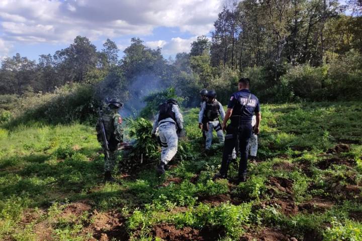NOTICIAS 12/09/2023SSP, Sedena y GN aseguran e incineran plantío de marihuana; en MoreliaProducto de las acciones interinstitucionales para el establecimiento del bienestar social, los elementos de las Secretarías de Seguridad Pública (SSP), y de la Defensa Nacional (Sedena), en conjunto con la Guardia Nacional (GN); localizaron e incineraron en Morelia un plantío de marihuana, y a su vez decomisaron varias plantas de esta misma droga en Uruapan.