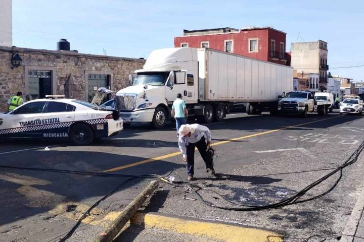 NOTICIAS 12/09/2023Tráiler jala cableado y derriba poste en el centro de Morelia; auto queda dañado