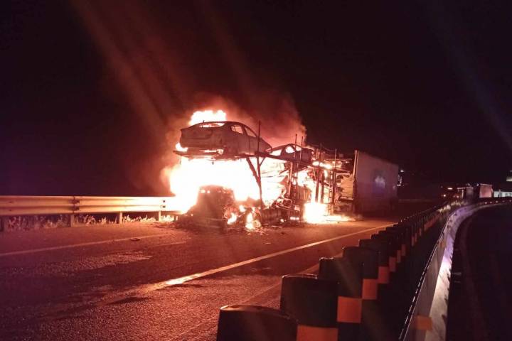 Un tráiler nodriza ardió en llamas junto con cuatro de los 10 vehículos que transportaba, esto sobre la carretera México-Guadalajara, dentro del municipio de Copándaro, informaron autoridades policiales y de rescate.