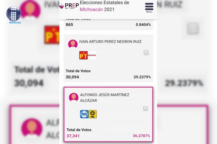 NOTICIAS 07/06/2021Consolida triunfo Alfonso Martínez; supera con 7 puntos a morena y 15 al PRIEl candidato de la alianza PAN-PRD a la presidencia municipal de Morelia, Alfonso Martínez Alcázar, se alza como el claro triunfador de las elecciones de este domingo al registrar un total de 78,720 votos contra 63,602 del candidato de morena y 47,522 del abanderado del PRI.