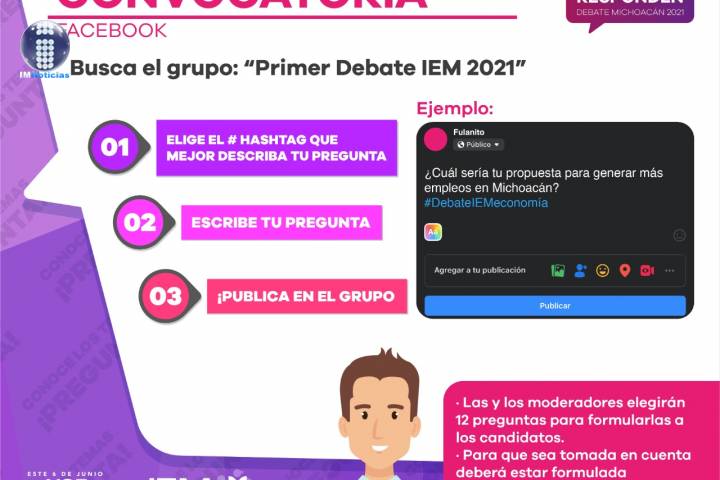 NOTICIAS 08/04/2021Convoca IEM a la ciudadanÃa a participar en el primer debate a la gubernatura del estadoCon el objetivo de incentivar la participación de la ciudadanÃa en los ejercicios democráticos, el Instituto Electoral de Michoacán (IEM) lanzó la Convocatoria de Participación Ciudadana para el Primer Debate a la Gubernatura del Estado de Michoacán, en la cual se indican los métodos para elaborar preguntas a través de redes sociales y de las cuales se hará una selección para que sean formuladas a la y los Candidatos el próximo 21 de ... Ver más...