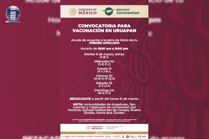 NOTICIAS 08/03/2021Garantizada, vacunación a adultos mayores en UruapanPara continuar con la Política Nacional de Vacunación contra el Virus SARS-CoV-2, el Gobierno de México iniciará el día de mañana la vacunación contra COVID-19 a adultos mayores de 60 años en Uruapan. La convocatoria se realizará en total coordinación con autoridades estatales y municipales, de acuerdo a la letra de inicio del primer apellido de las personas.