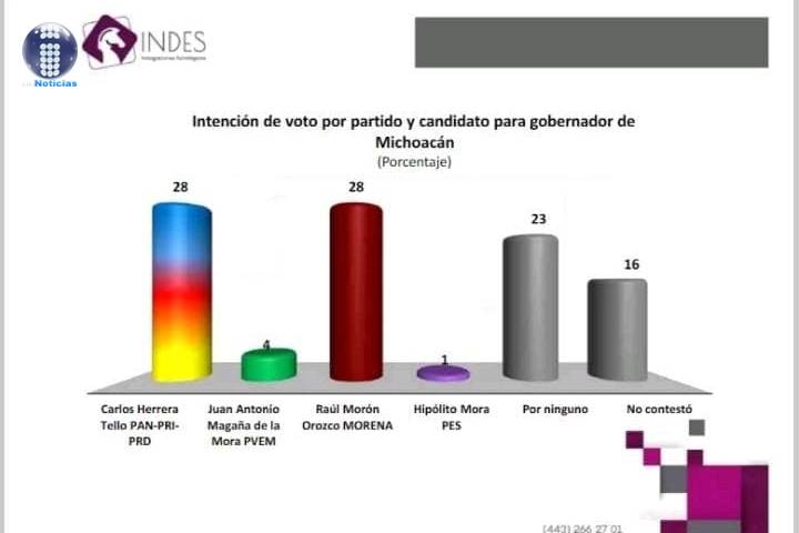 De acuerdo a las cifras, a unos meses de la contienda electoral, la eventual alianza del Equipo por Michoacán del PAN-PRD-PRI tiene 28 puntos de preferencia electoral encabezada por Carlos Herrera Tello.