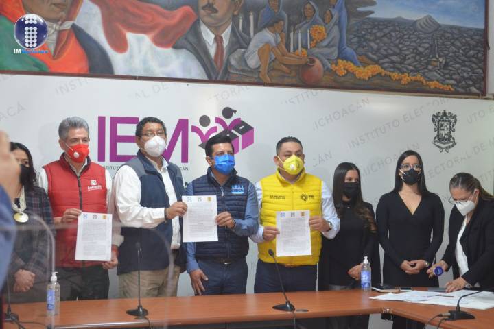 Los dirigentes estatales del Partido Acción Nacional (PAN), Partido de la Revolución Democrática (PRD) y Partido Revolucionario Institucional (PRI), Óscar Escobar Ledesma, Víctor Manríquez y Jesús Hernández Peña, presentaron su Convenio de Candidatura Común para el gobierno del estado llamada Equipo por Michoacán, ante el consejo del Instituto Electoral de Michoacán (IEM).