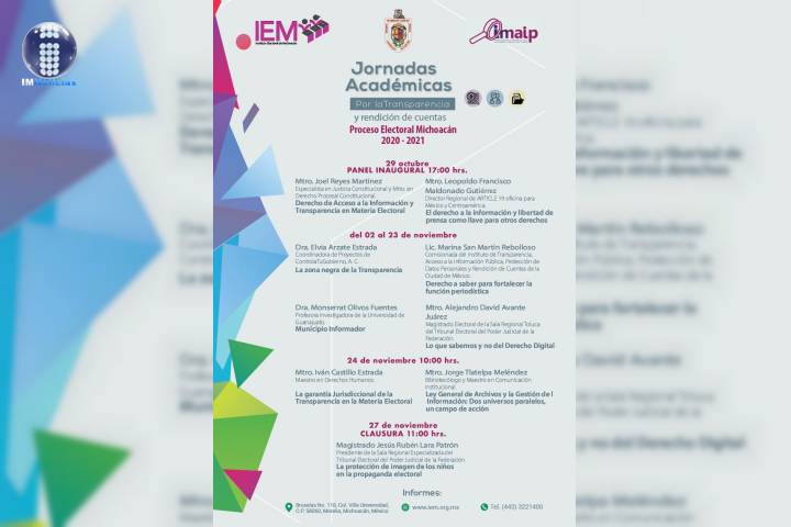 NOTICIAS 28/10/2020Realizarán Primeras Jornadas Académicas por la Transparencia y la Rendición de CuentasPara contar con un Proceso Electoral Local 2020-2021 en Michoacán acorde a la exigencia de la ciudadanía sobre el correcto uso de los recursos, el Instituto Electoral de Michoacán (IEM), el Instituto Michoacano de Transparencia Acceso a la Información y Protección de Datos Personales y la Facultad de Derecho y Ciencias Sociales, organizan y te invita a las Primeras Jornadas Académicas por la Transparencia y la Rendición de Cuentas.