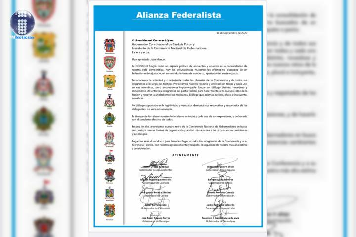 NOTICIAS 20/09/2020Formaliza Alianza Federalista salida de la CONAGOEn atento y puntual comunicado enviado el día de ayer, los mandatarios de la Alianza Federalista, oficializaron a la Confederación Nacional de Gobernadores (CONAGO) su unánime determinación de retirarse de ella en la búsqueda de construir un nuevo y efectivo espacio de encuentro democrático.