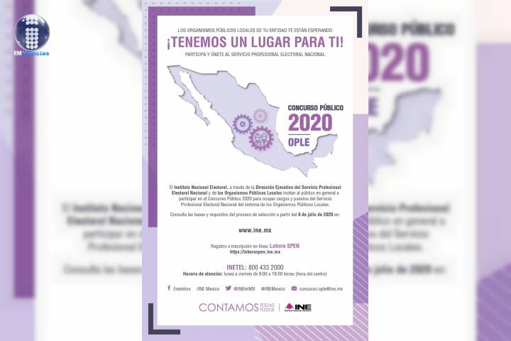 NOTICIAS 09/07/2020Lanza INE convocatoria para ocupar 4 vacantes del servicio profesional electoral nacional en el IEMEl Instituto Nacional Electoral (INE) pone a disposición de la ciudadanía en general la Convocatoria del Concurso Público del Servicio Profesional Electoral Nacional del Sistema de los OPL 2020, dentro de la cual el Instituto Electoral de Michoacán oferta 4 vacantes.