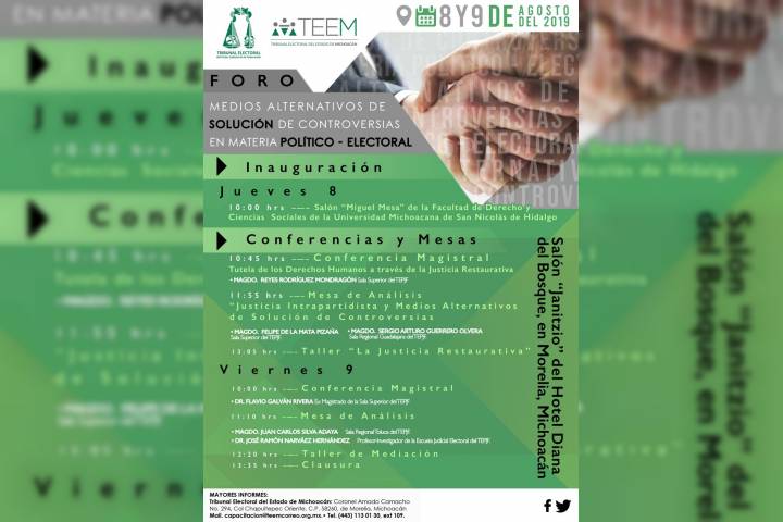 La Sala Superior del Tribunal Electoral del Poder Judicial de la Federación (TEPJF) y el Tribunal Electoral del Estado de Michoacán (TEEM) realizarán el Foro "Medios Alternativos de Solución de Controversias en Materia Político-Electoral" en la Ciudad de Morelia, Michoacán, los días 8 y 9 de agosto del presente año.