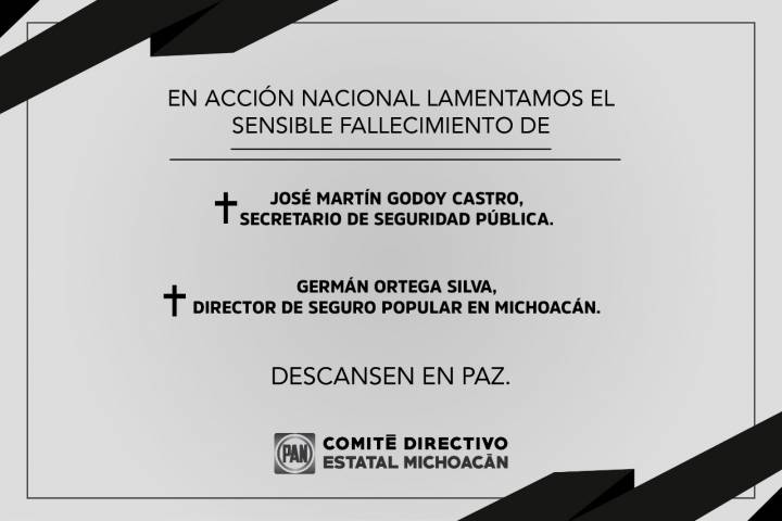 NOTICIAS 24/07/2019Lamenta PAN fallecimiento de Godoy Castro y Germán Ortega El Partido Acción Nacional lamenta el fallecimiento de José Martín Godoy Castro, secretario de Seguridad Pública y Germán Ortega Silva, director de Seguro Popular en Michoacán.
