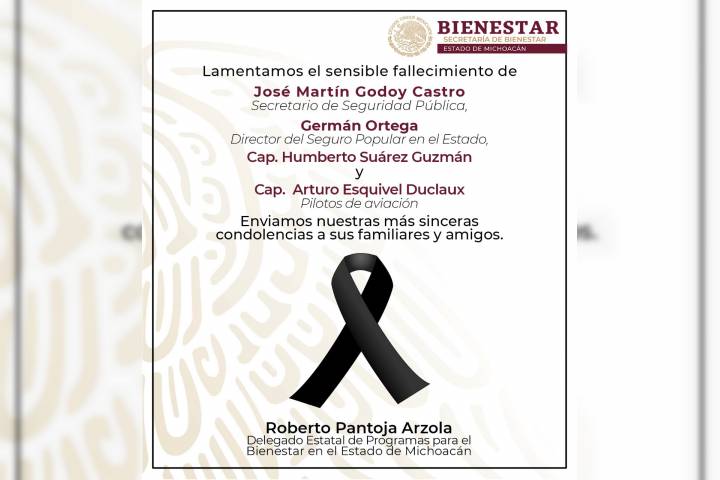 NOTICIAS 24/07/2019Lamenta Roberto Pantoja fallecimientos por desplome de helicóptero en MichoacánEl Delegado Estatal de Programas para el Bienestar en el Estado de Michoacán, Roberto Pantoja Arzola, lamentó el fallecimiento del secretario de Seguridad Pública, José Martín Godoy Castro, del director estatal del Seguro Popular, Germán Ortega Silva y de los pilotos Humberto Suárez Guzmán y Arturo Esquivel Duclaux, en el accidente aéreo registrado esta mañana.