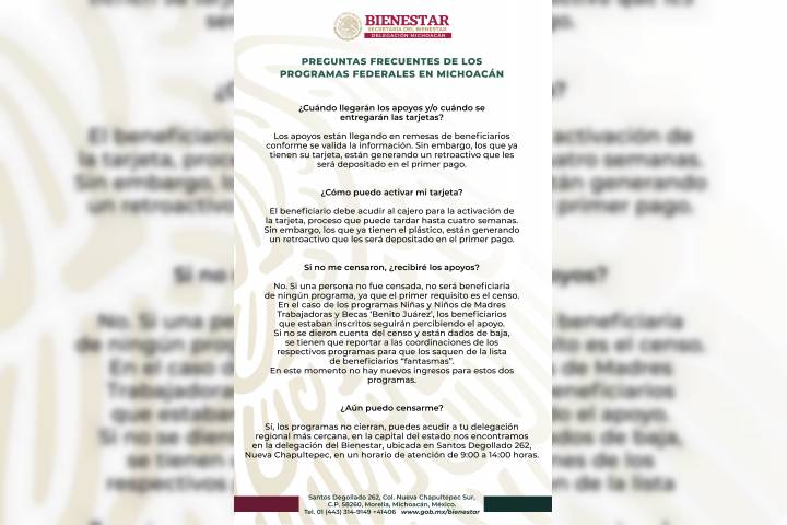 NOTICIAS 13/06/2019Continúa con normalidad entrega de apoyos de programas federales en Michoacán En atención a los beneficiarios de los programas del Gobierno Federal, la Delegación de la Secretaría del Bienestar en Michoacán responde a las dudas más frecuentes de la ciudadanía.