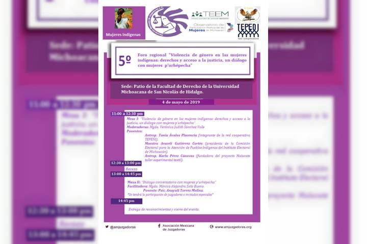 El Tribunal Electoral del Estado de Michoacán, la Asociación Mexicana de Juzgadoras A.C., el Observatorio de Participación Política de las Mujeres en Michoacán y la Red Cooperativa TEPENI, los días 3 y 4 de Mayo del presente año, realizarán el Quinto Foro Regional "Violencia de Género en las Mujeres Indígenas: Derechos y Acceso a la Justicia, un Diálogo con Mujeres P'urhépecha".