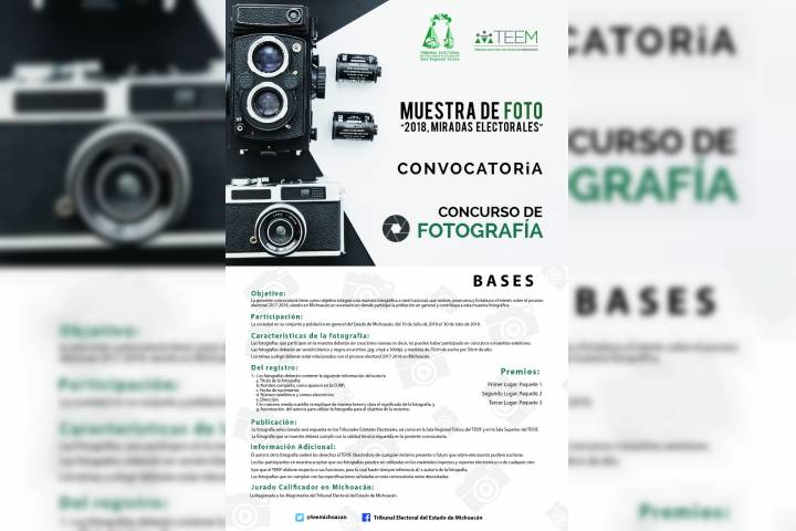 El Tribunal Electoral del Estado de Michoacán convoca a la sociedad en conjunto y población en general del estado a participar en el Concurso de Fotografía "2018, Miradas Electorales", con el propósito de fortalecer la cultura de la legalidad y la procuración de justicia en materia electoral.