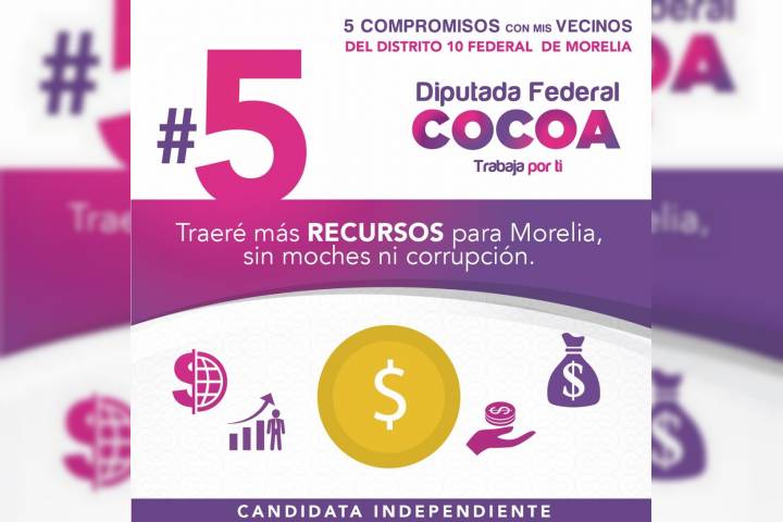 NOTICIAS 25/06/2018Traeré más recursos para Morelia, sin moches ni corrupción: Cocoa Calderón "Mi compromiso es contigo y trabajaré intensamente para traer más recursos que nunca a nuestra Ciudad, promoviendo proyectos estratégicos que detonen empleos, áreas verdes, espacios deportivos y culturales, infraestructura vial y espacios públicos para ti! ¡Sin corrupción! ¡Sin moches!" así lo señaló la candidata Independiente por el distrito 10 federal de Morelia, Luisa María Calderón "Cocoa" quién reafirmó su compromiso por la c... Ver más...