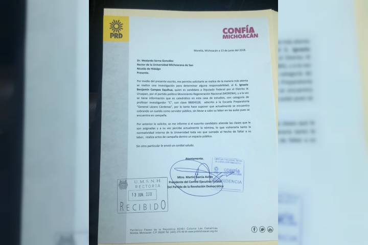 NOTICIAS 13/06/2018Formaliza PRD, ante UMSNH, petición de proceso de investigación contra candidato de Morena El dirigente estatal del Partido de la Revolución Democrática (PRD), Martín García Avilés, hizo entrega de un documento ante la Rectoría de la Universidad Michoacana de San Nicolás de Hidalgo para que se inicie la investigación en contra de Ignacio Campos, candidato de Morena a una diputación por el Distrito de Uruapan.