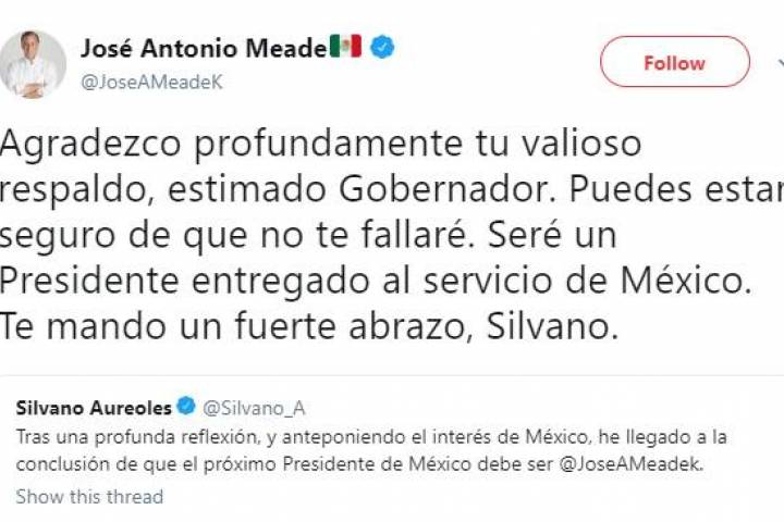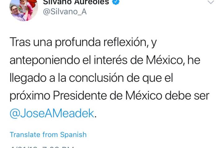 NOTICIAS 21/04/2018Para Silvano Aureoles, Meade debe ser el Presidente de México "Tras una profunda reflexión, y anteponiendo el interés de México, he llegado a la conclusión de que el próximo presidente de México debe ser @JoseAMeadek", escribió esta tarde en su cuenta de twitter el gobernador de Michoacán, Silvano Aureoles Conejo.