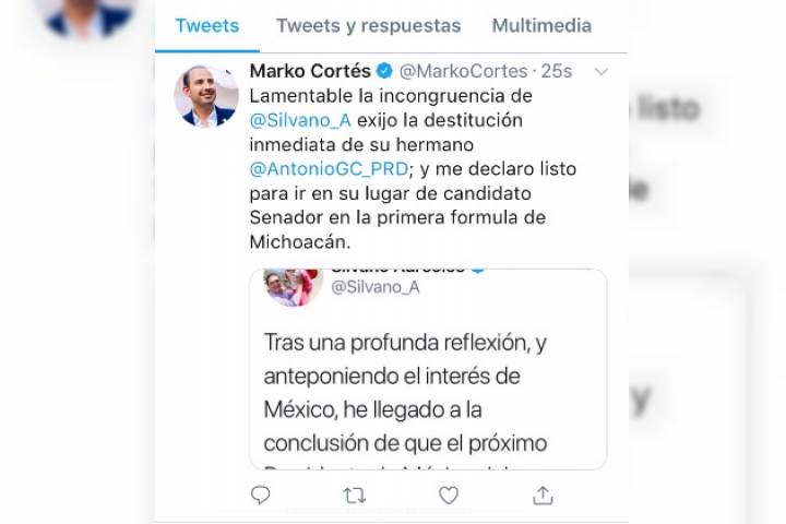 Ante la determinación del Gobernador Silvano Aureoles Conejo de respaldar a José Antonio Meade a la Presidencia de la República, el Partido Acción Nacional en Michoacán calificó de incongruente tal decisión y exigió la destitución inmediata de Antonio GarcÃa Conejo como aspirante por la Coalición Por México al Frente rumbo al Senado de la República, "ahora Marko Cortés es nuestro candidato".