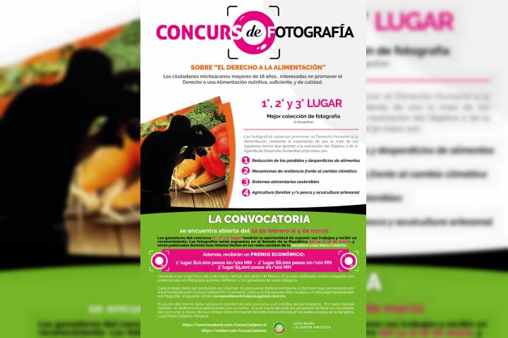 NOTICIAS 13/02/2018Lanza Luisa María Calderón Convocatoria al "Concurso de Fotografía sobre el Derecho a la Alimentación"La Senadora Luisa María Calderón Hinojosa, a través de sus redes sociales dio a conocer e invitó a los ciudadanos michoacanos mayores de edad a participar en la Convocatoria del "Concurso de Fotografía sobre el Derecho a la Alimentación", con el cual, se pretende visibilizar la problemática que existe en temas de Alimentación, Pérdida de Desperdicios de Alimentos, Agricultura Familiar, así como la situación de la Agricultura frente al... Ver más...