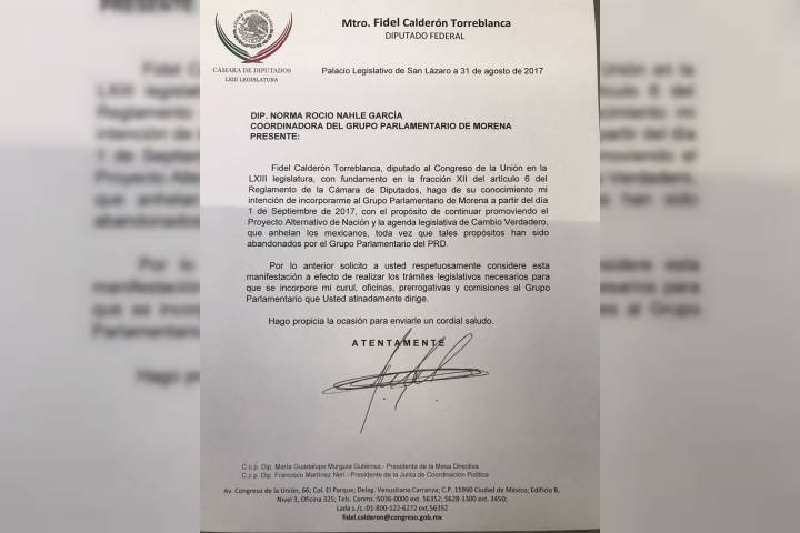 El diputado federal, Fidel Calderón Torreblanca, solicitó su integración al Grupo Parlamentario de MORENA en la Cámara de Diputados.