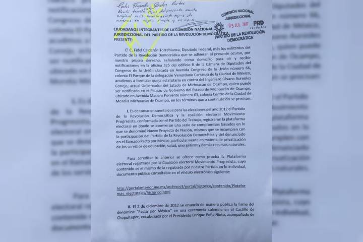 La queja presentada ante la Comisión Nacional Jurisdiccional del PRD establece, entre otros puntos que la firma de Aureoles Conejo en... Ver más...