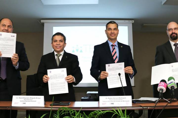 El Tribunal Electoral del Estado de Michoacán, a través de su Presidente el Doctor Rubén Herrera RodrÃguez, el licenciado David Alejandro Delgado Arroyo, Vocal Ejecutivo del Instituto Nacional Electoral en el Estado, el Doctor Ramón Hernández Reyes, Consejero Presidente del Instituto Electoral de Michoacán y el Doctor Luis Roberto Mantilla Sahagún, Rector de la Universidad Latina de América, firmaron convenio de colaboración para impl... Ver más...