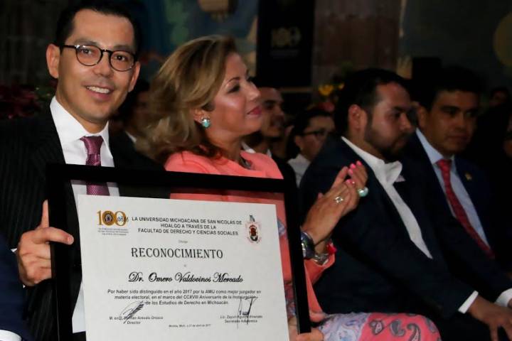 Medardo Serna González, rector de la Universidad Michoacana de San Nicolás de Hidalgo entregó al Doctor Omero Valdovinos Mercado, Magistrado del Tribunal Electoral del Estado de Michoacán, un reconocimiento por su destacada trayectoria profesional y jurisdiccional, impartiendo justicia siempre en beneficio de la sociedad mexicana.