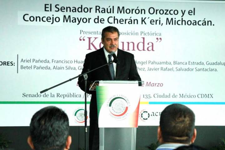 El senador Raúl Morón Orozco inauguró la exposición pictórica "Korunda", así como la muestra gastronómica, artesanal y cultural, montada por el Concejo Mayor de Cherán K'eri del Estado de Michoacán, que se desarrolló en el Patio Central del Federalismo del Senado de la República.