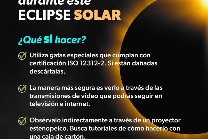 NOTICIAS 08/04/2024Advierte SSM los daños a la salud por observar el eclipse solar sin protecciónVisión borrosa, inflamación de retinas y hasta ceguera parcial o total, son los daños que puede sufrir una persona si observa sin protección adecuada el eclipse solar total que ocurrirá este lunes en gran parte de México, advirtió la Secretaría de Salud de Michoacán (SSM).