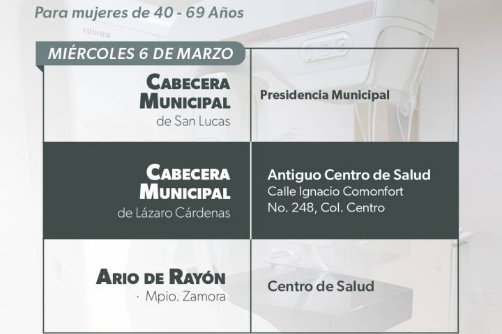 NOTICIAS 06/03/2024SSM realizará mastografías en 4 municipios de MichoacánTodas las mujeres de 40 a 69 años de edad de los municipios de Lázaro Cárdenas y San Lucas, así como de la localidad de Ario de Rayón perteneciente a Zamora, podrán acudir hoy a realizarse una mastografía a las unidades móviles de la Secretaría de Salud de Michoacán (SSM) que atenderán de 9:00 a 18:00 horas.